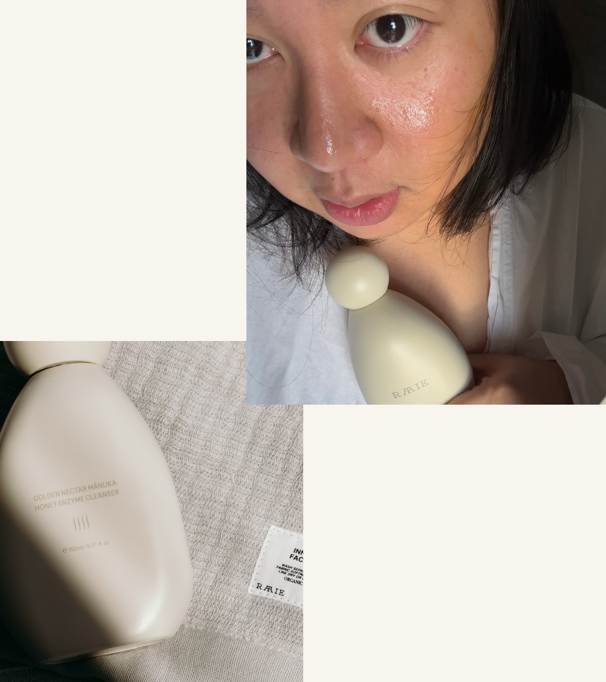 While cleansing marks the start and end of my day, both rituals serve a different purpose. In the morning I swear by the sweet scent of mānuka to awaken my senses and breathe life into my weary complexion – a slow massage followed by splashes of cold water at the sink and I’m ready to hit the pavement or pilates mat. My evening cleanse is the first step in a rather lengthy wind-down routine – almost always accompanied with a cup of tea and a dose of ashwagandha to calm the mind. I cleanse twice, once with vigour to remove the stresses (and SPF-induced sebum) of the day, and then again for my now-bare skin to reap the benefits of the cleanser – and the several layers of skincare that follow (there are many!).